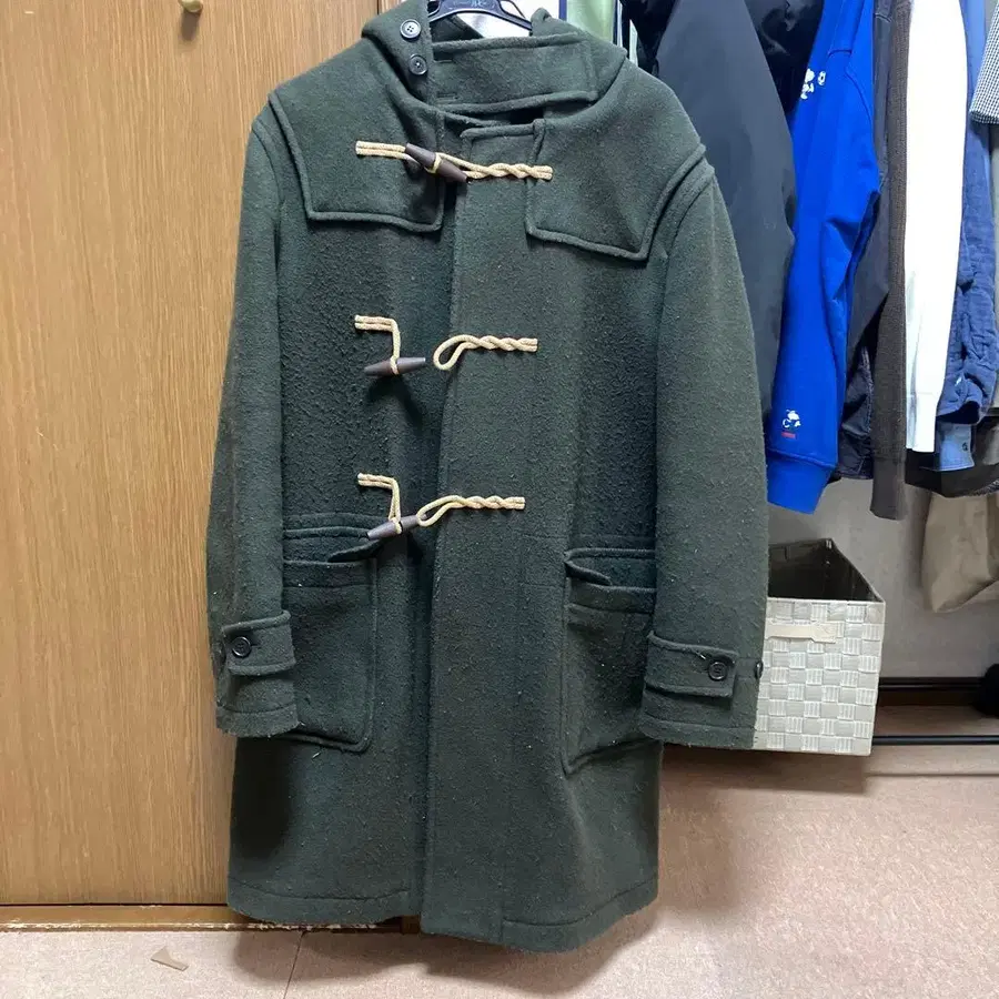 이 페이지를 방문해 주셔서 감사합니다. 유니클로에서 과거에 입었던 푸른빛이 도는 짙은 녹색 더플 코트입니다. 유니클로 L 사이즈입니다. 눈에 띄는 올풀림, 얼룩, 찢김 등은 없으나 목 부분의 잠그는 버튼이 과거에 떨어진 것을 주변 색과 어울리는 브라운 실로 꿰매어 놓았습니다. 평소 사용하는 데에는 특별한 문제가 없습니다.