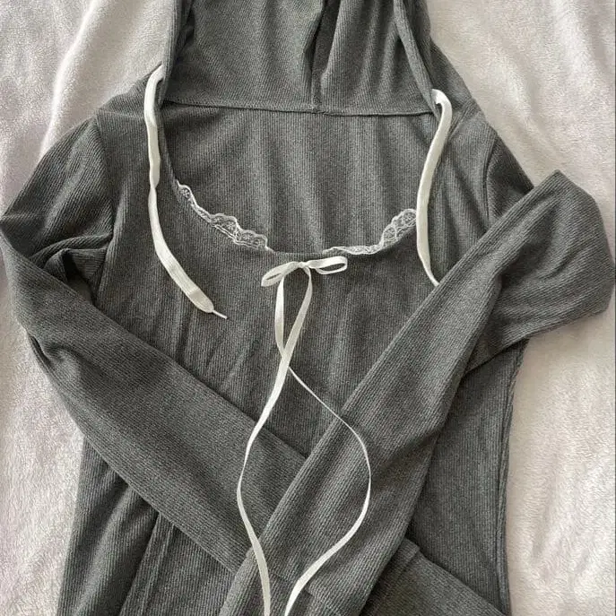 레이스 넥 리본 후드 셋업