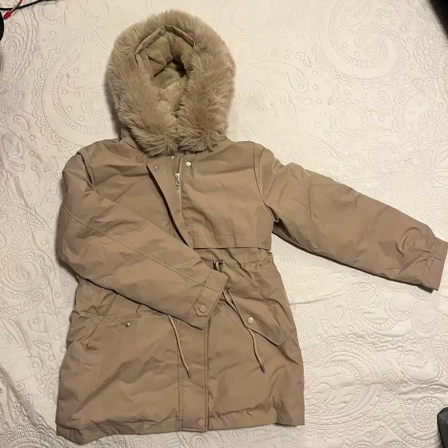 베이지 다운 자켓 퍼 달린 후드