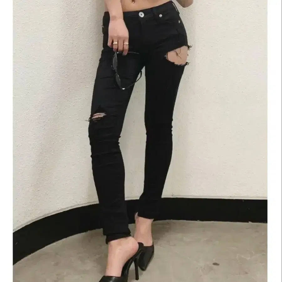 GYDA 블랙 데미지 미들 허리 스키니 데님