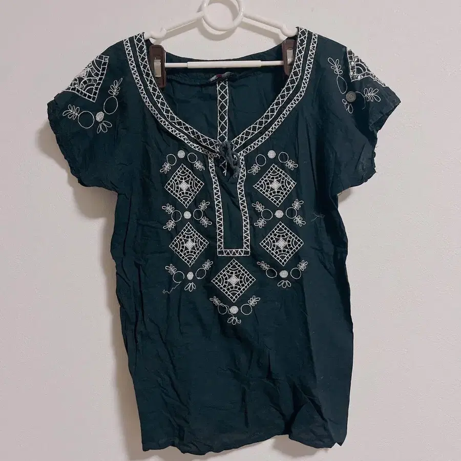 자동 번역되었어요. 원문보기블랙 자수 반팔 튜닉, M 사이즈.