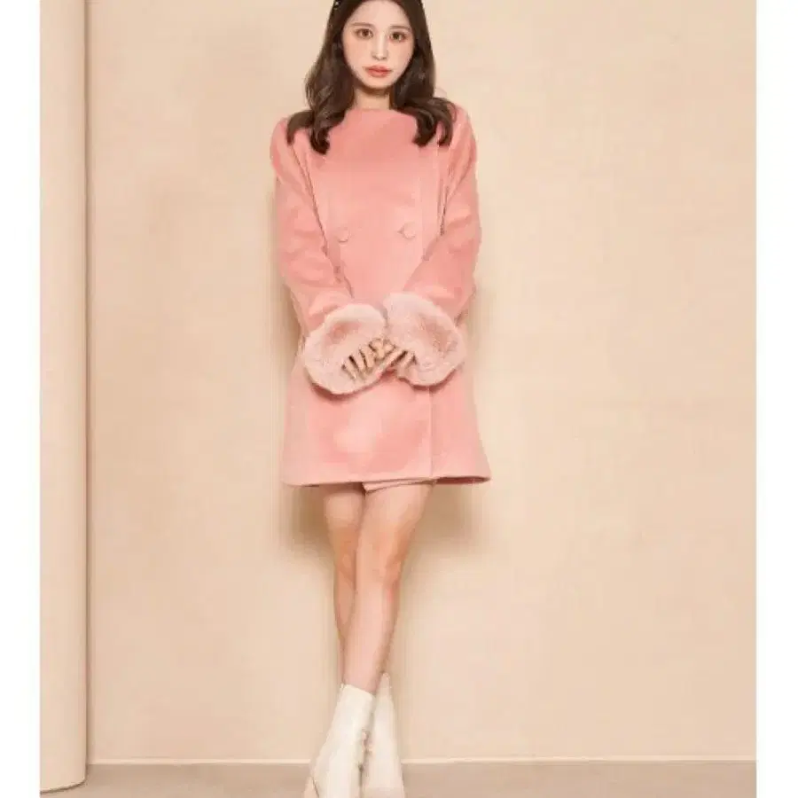 다리치 퍼 소매 핑크 더블 브레스트 코트, 울 혼방 소재로 따뜻함을 제공합니다.