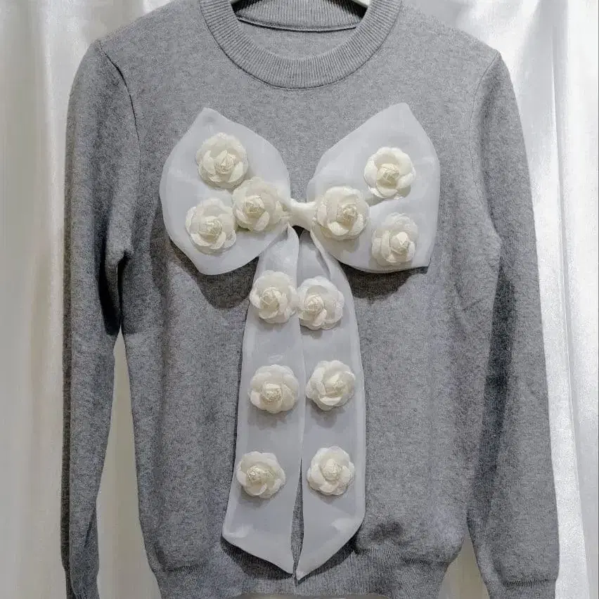 리본 꽃 장식 그레이 니트 스웨터