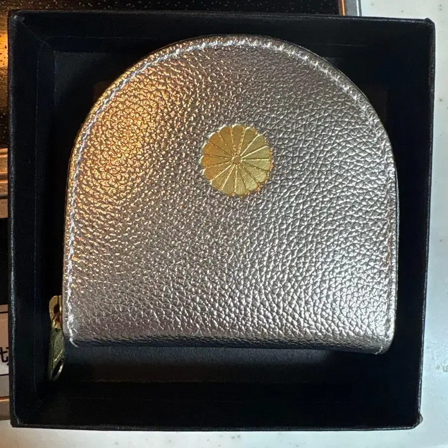 황궁 실버 색상의 가죽으로 만들어진 반원형 코인 케이스, 골드 컬러 무늬 포함. - 색상: 실버 - 디자인: 반원형 - 소재: 가죽 - 장식: 골드 컬러 무늬 - 사이즈: 소형 국화 잎 문화 협회 방문해 주셔서 감사합니다.