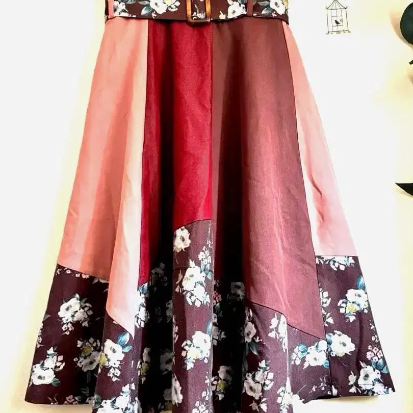 ○ axes femme의, 핑크 계열에 꽃무늬가 콜라주된 클래시컬하고 걸리시한 귀여운 스커트입니다.
