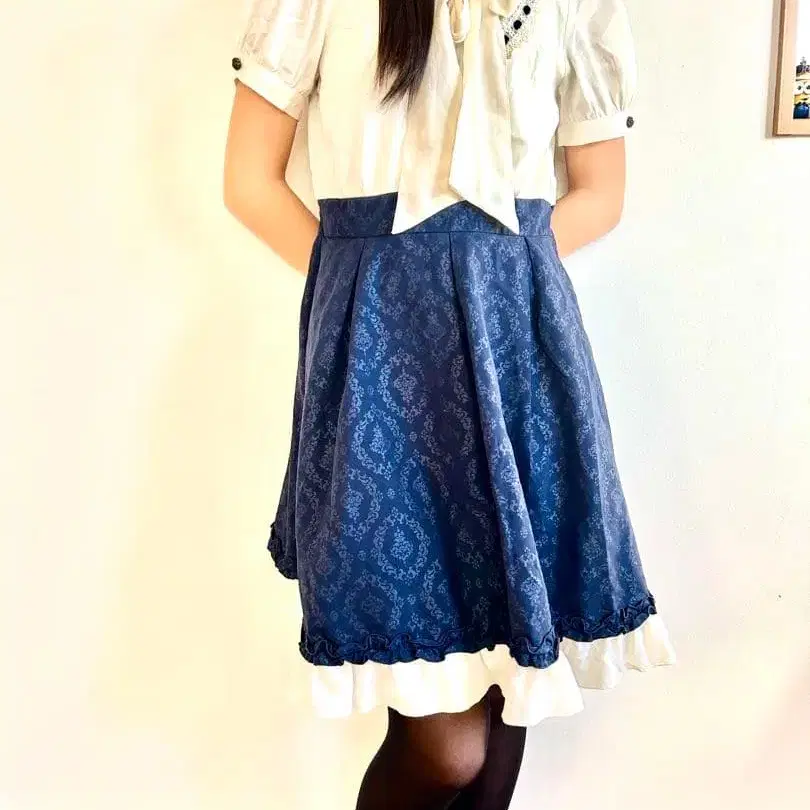 리본 포함 네이비와 화이트의 무릎 기장 원피스