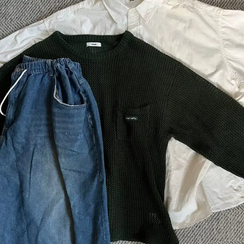전신 Perushu 코디 셔츠와 그린 가디건과 데님 팬츠 세트