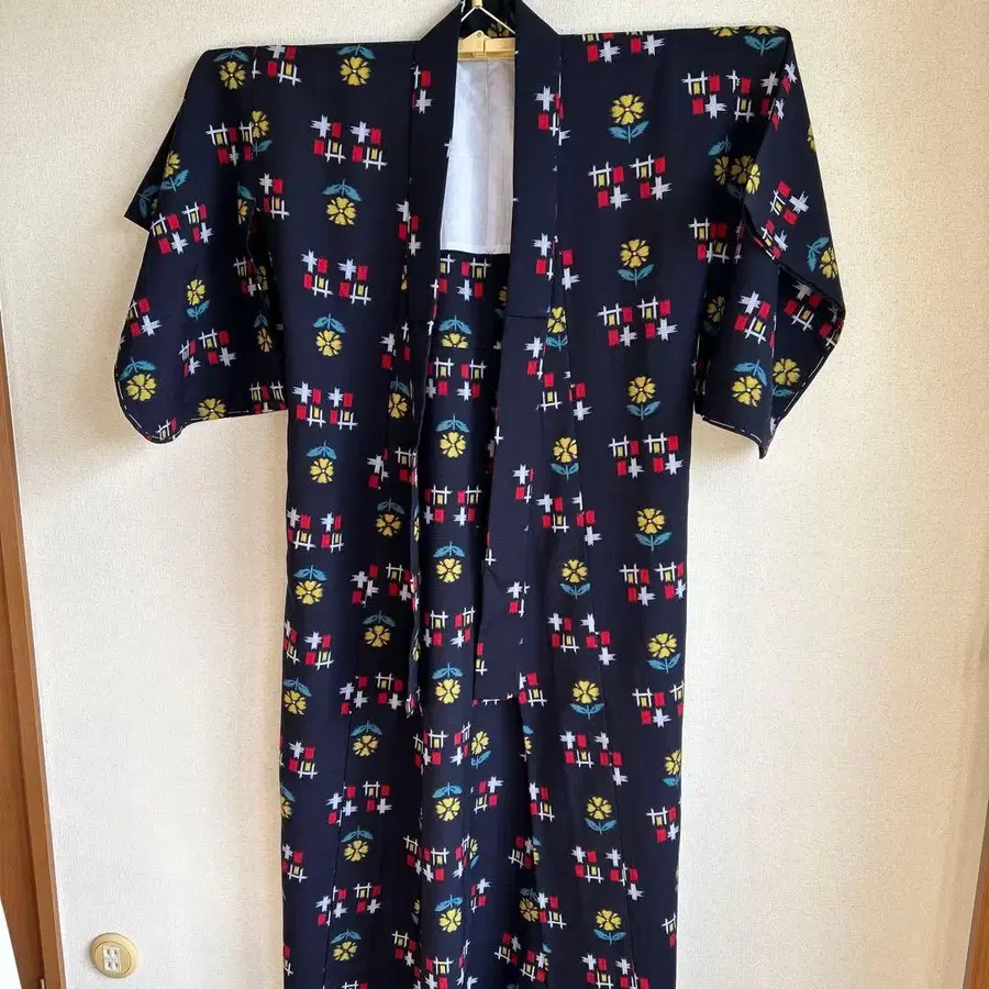 쇼와 레트로 꽃무늬 기모노 블랙, 레드, 옐로우