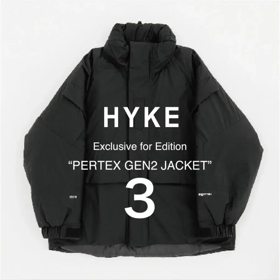 HYKE의 익스클루시브 아이템인 PERTEX GEN2 JACKET은 내구성이 뛰어난 소재로 만들어진 블랙 다운 자켓입니다.