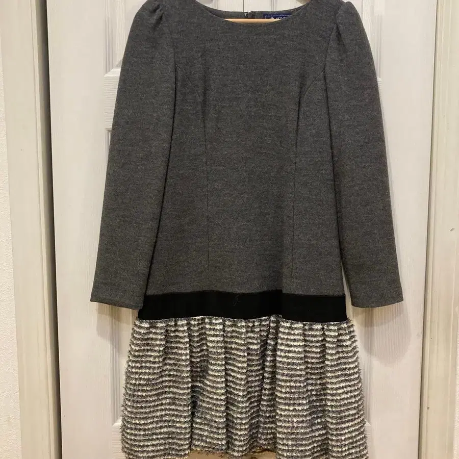고급 울 100%의 그레이 색상 몸판에, 밑단은 화려한 모노톤 트위드 소재로 절개된, 브랜드다운 고급스럽고 성숙/러블리한 디자인입니다.
