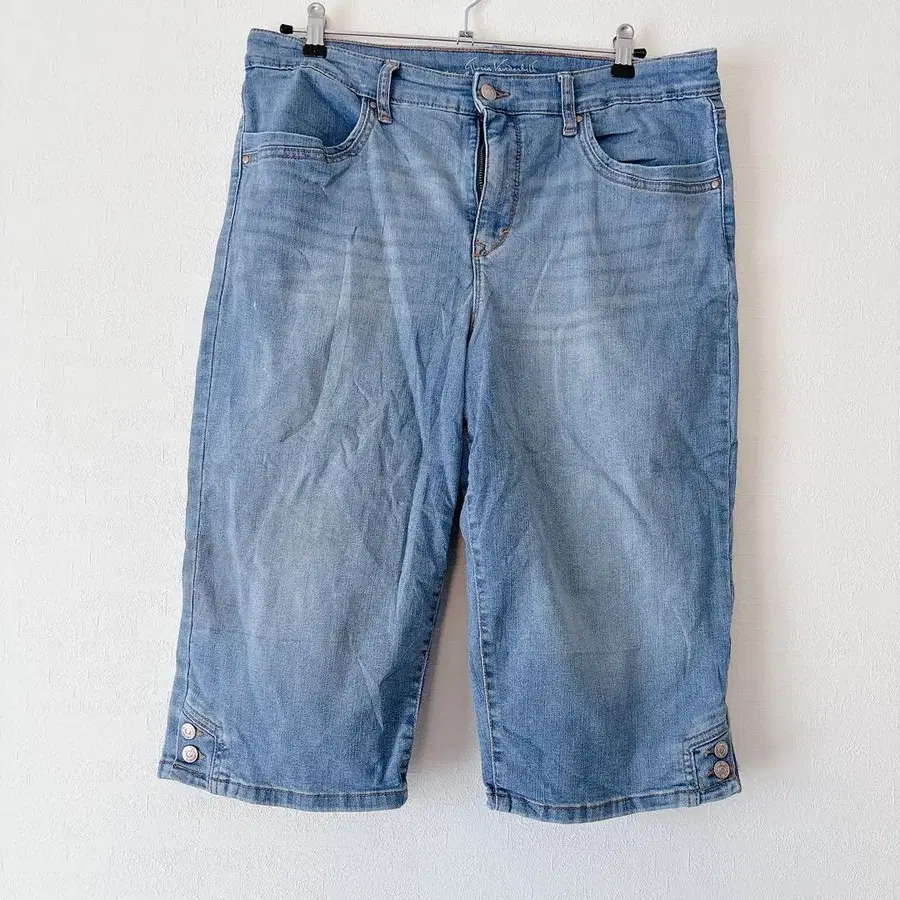 자동 번역되었어요. 원문보기라이트 블루 슬림핏 숏팬츠, 버튼 디테일 밑단.