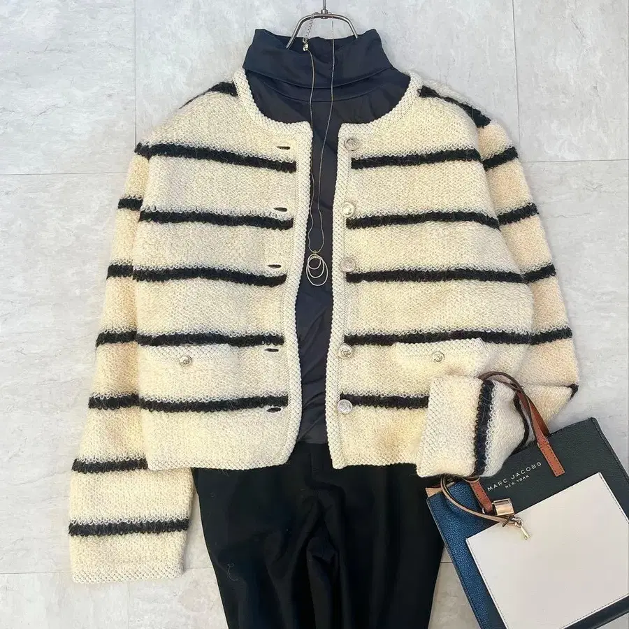 새상품급 시너리 트위드 보더 니트 자켓 알파카 혼합