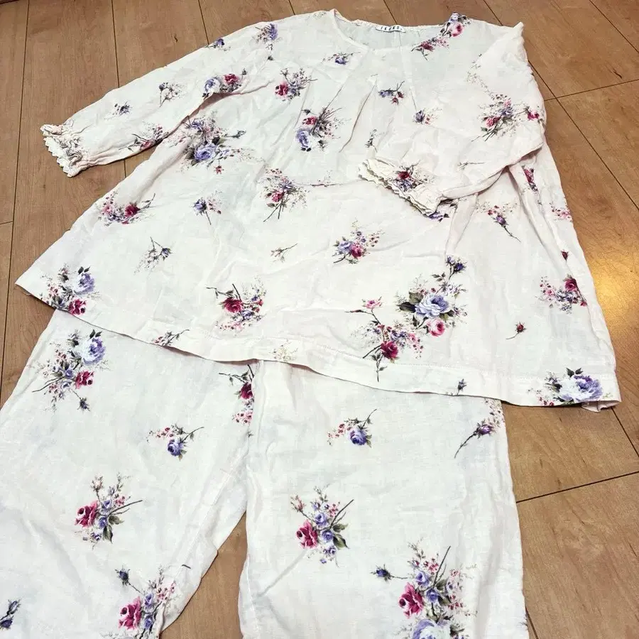 사용감은 거의 없다고 생각합니다. 거즈 원단으로 촉감이 좋습니다. 상하의 세트. 사이즈 - 2 색상 - 연한 핑크 소재 - 원단 면 100% 레이스 면 100% 기장 - 약 67cm 가슴 너비 - 약 52cm 허리 - 약 31cm(밴딩 포함) 총장 - 약 91cm 홈웨어 파자마 꽃무늬 셋업