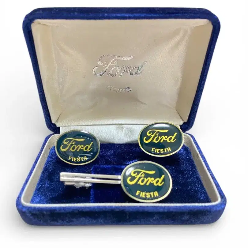자동 번역되었어요. 원문보기Ford Fiesta 넥타이핀과 커프스 단추 세트, 파랑과 금색 디자인이 특징.