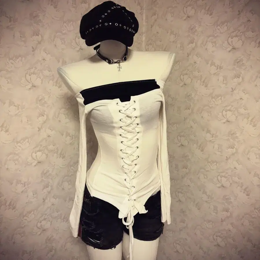 새상품 헤이세이 갸루 00s 레이스업 긴팔 상의 화이트/블랙
