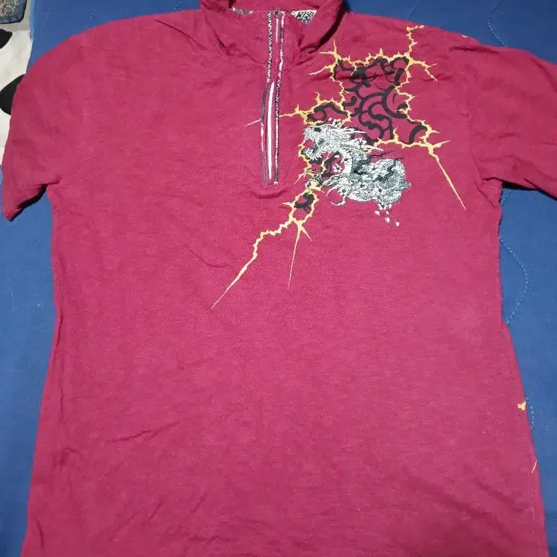 드래곤 자수 빨간색 하프 지퍼 피케 셔츠 새상품급