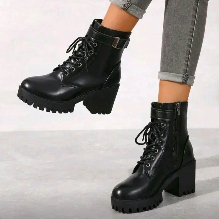 레이스업 블랙 부츠 중간 힐 통굽 24.5cm