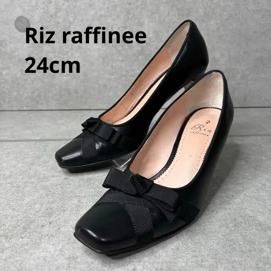 새상품급 리즈라피네 천연 가죽 펌프스 24 2E 블랙 리본 스퀘어토