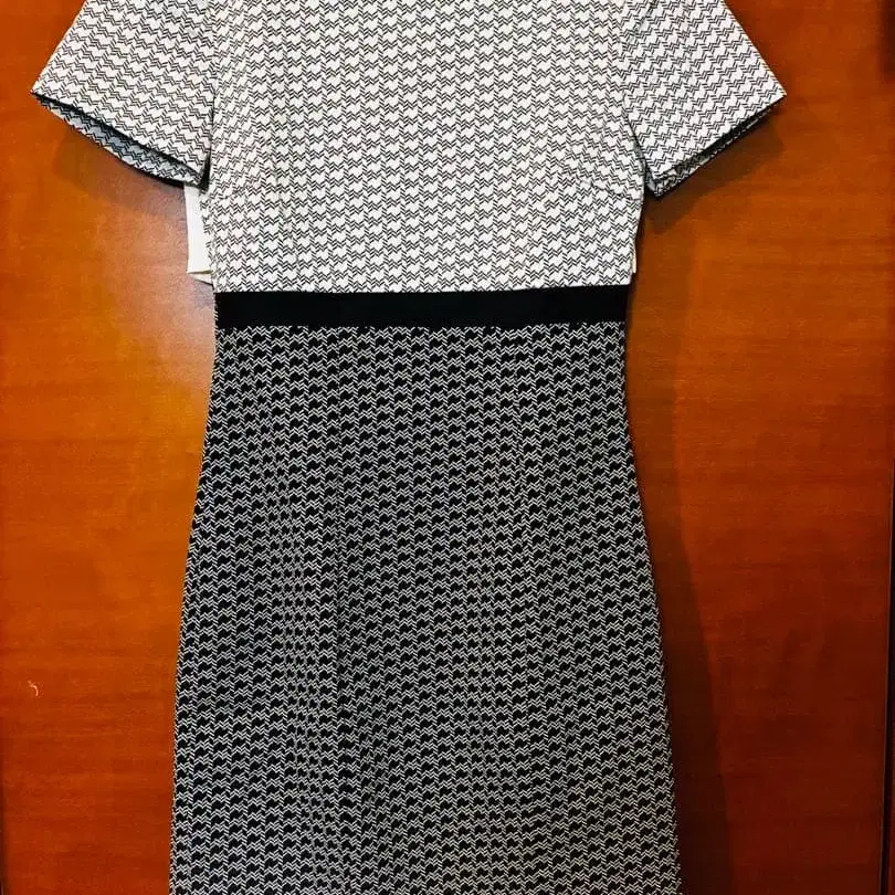 M AX&co 화이트 블랙 패턴 반팔 무릎 기장 원피스