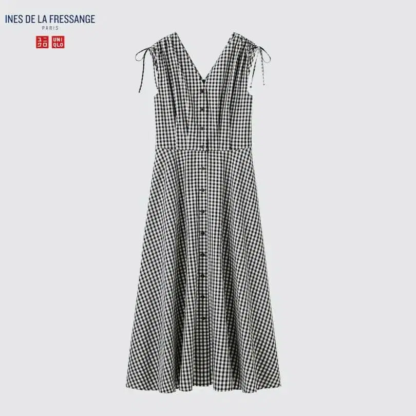 유니클로 이네스 코튼 플레어 V넥 원피스 깅엄 체크 블랙