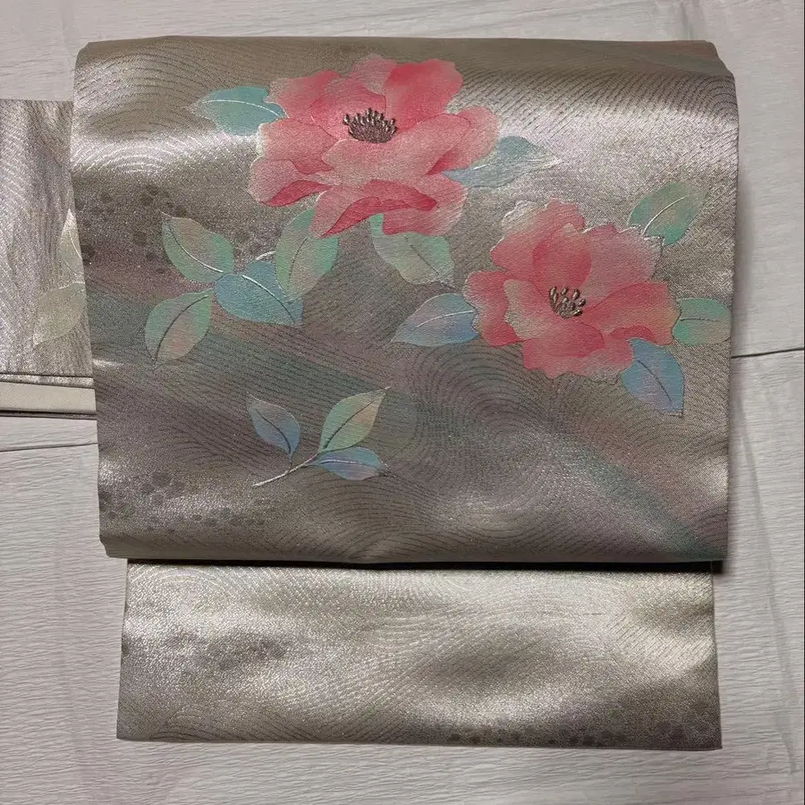 미사용 나고야 오비 실버 핑크 꽃무늬