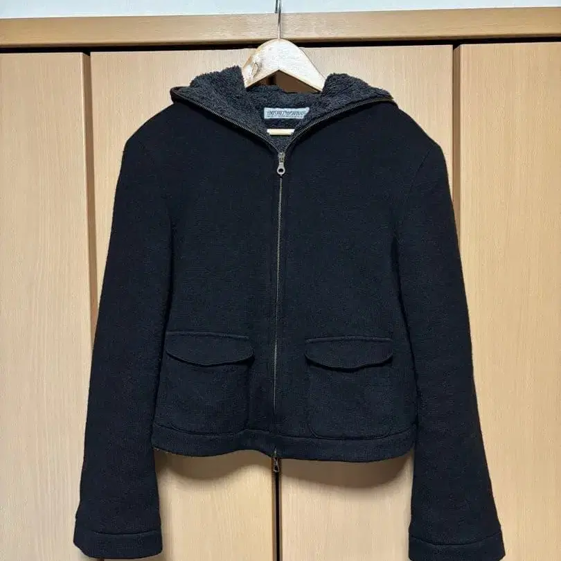 당시 아르마니 특유의 풀 집업 디테일, 뒷면 버클, 짧은 기장 실루엣, 안쪽 보아, 더블 지퍼.