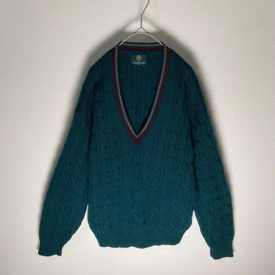 [ 포인트 ] L 다크 그린 빨간색과 베이지색 넥라인 V넥 케이블 짜임 버튼 프론트 울 100%