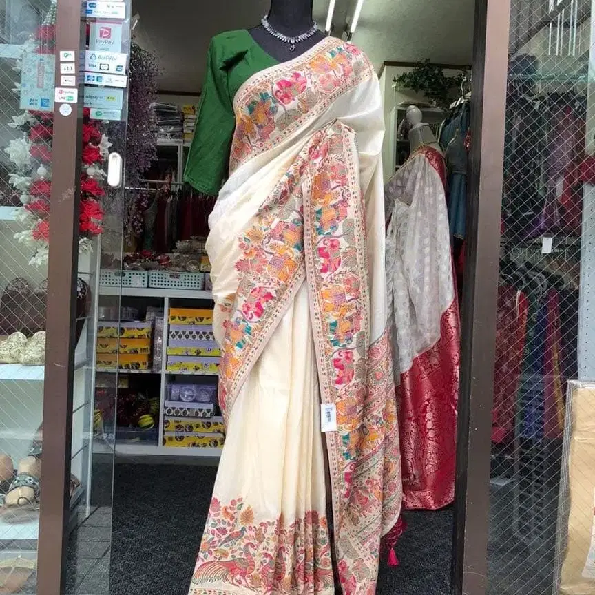 크림색 자수가 놓인 트래디셔널한 사리, 태슬 장식으로 엘레강트한 인상.(사리만 해당) 세계 최고의 민족 의상이라 불리는 인도의 의상 사리. Premium Quality 프리 사이즈 ( 약 110 cm x 550 cm ) 소재: 인도 실크 색상: 크림색 디자인: 트래디셔널 스타일: 사리 특징: 태슬 포함 장식: 자수 솔기가 없는 블라우스 (약 110 cm x 90cm ) 사리만 해당 #코스프레 #파티 #졸업 #밸리댄스 #사리 #결혼식 의상 #리셉션 #pabiscollectionsaree 참고: 블라우스 스티치를 원하시면, 블라우스 스티치 비용으로 3500엔, 페티코트 비용으로 1500엔이 별도로 부과됩니다. 블라우스 스티치와 페티코트 추가를 원하시면 댓글란에 기입해 주세요.