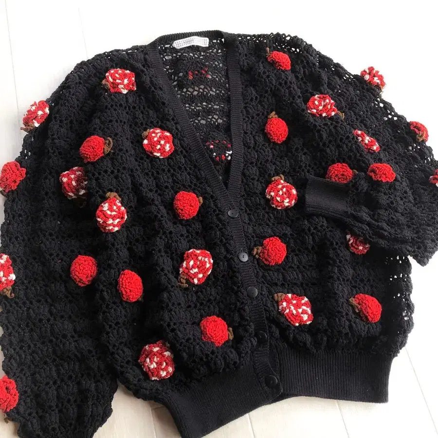 카네코 이사오 카네이션 꽃 모티브 시스루 편직 블랙 가디건