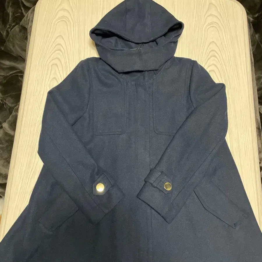 스콧 클럽 후드 부착 네이비 컬러 A라인 코트