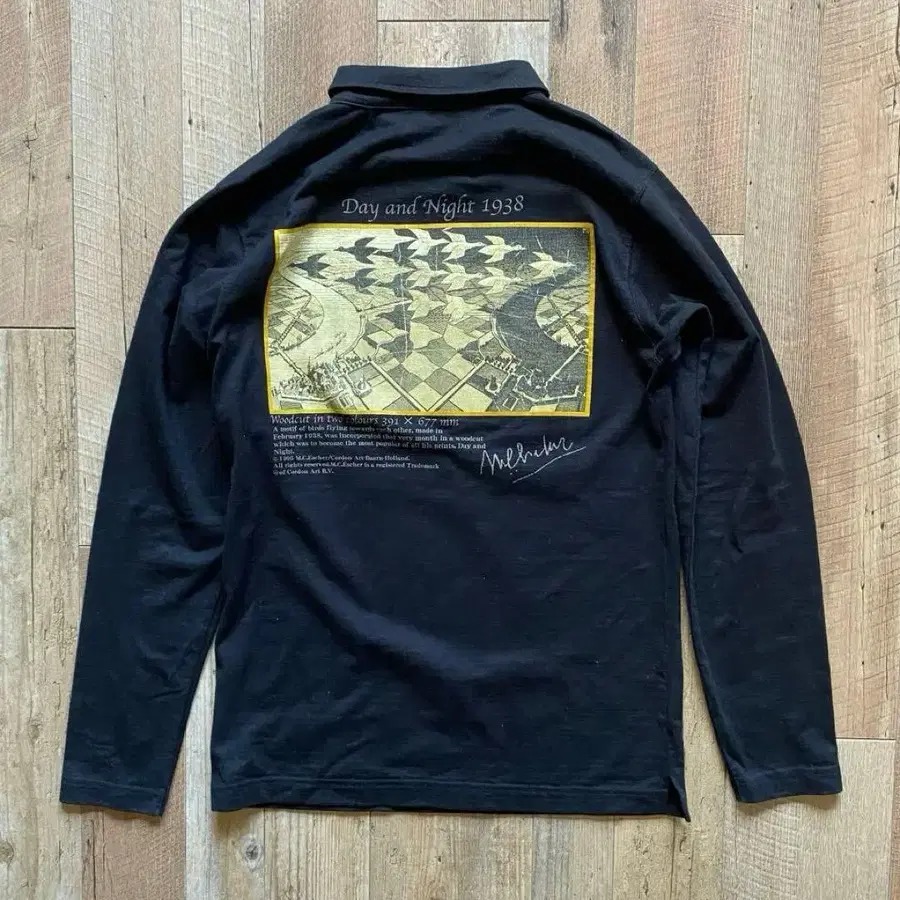 Day and Night 1938 에셔의 명화, [낮과 밤] 아트 프린트가 들어간 블랙 색상의 얇은 하프 지퍼 긴팔 맨투맨입니다.