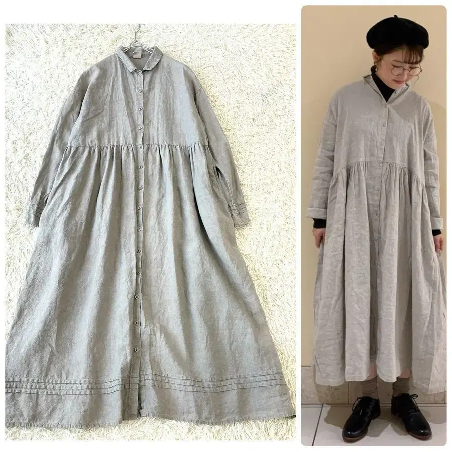 THUHARU 린넨 원피스 롱 핀턱 베이지