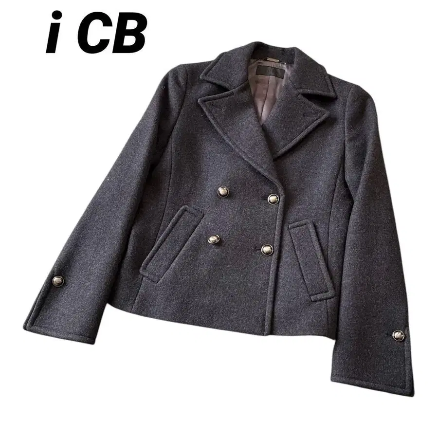 자동 번역되었어요. 원문보기그레이 색상의 100% 울 소재 더블 브레스트 테일러드 자켓, ICB 브랜드, 스타일리시한 디자인.
