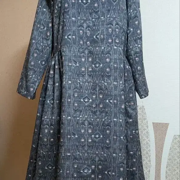 자동 번역되었어요. 원문보기그레이의 무늬가 들어간 롱 원피스, A라인 디자인의 긴팔 스타일.