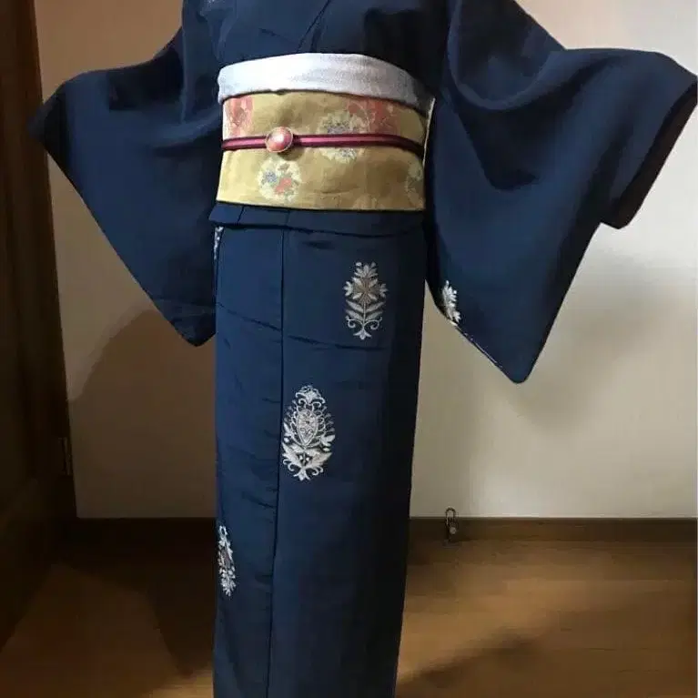 앤티크 기모노 다크 네이비 반짝이는 아르누보 패턴 오메시