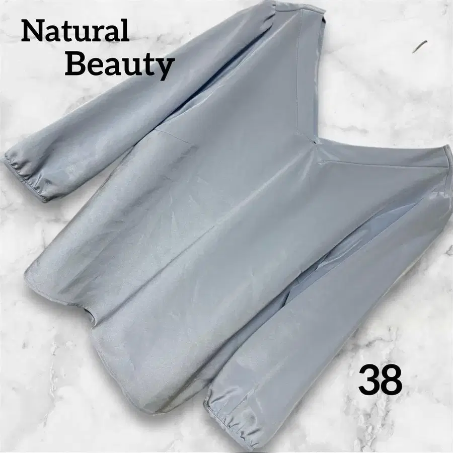 [내추럴 뷰티] 라이트 블루 V넥 7부 소매 블라우스 리본 38 M
