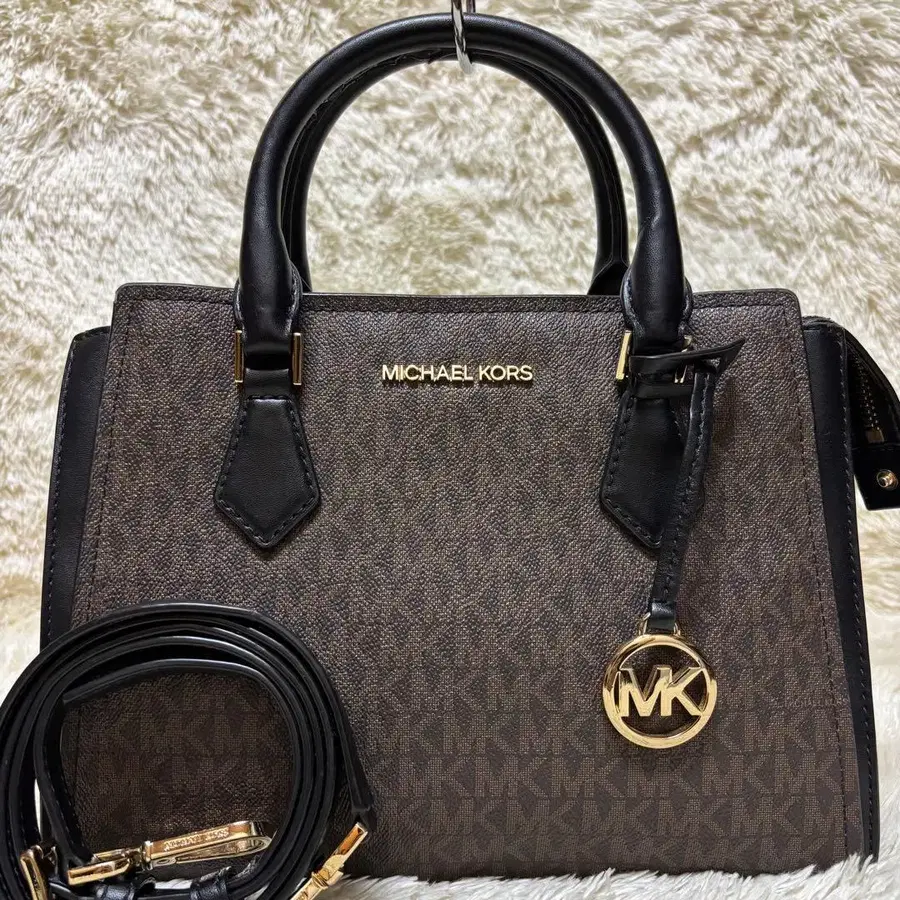 레어 마이클코어스 새첼 스몰 가죽 브라운 2way MK 패턴 참 포함 자립 인기 핸드백 토트백 출퇴근 통학 멋스러운 여성용