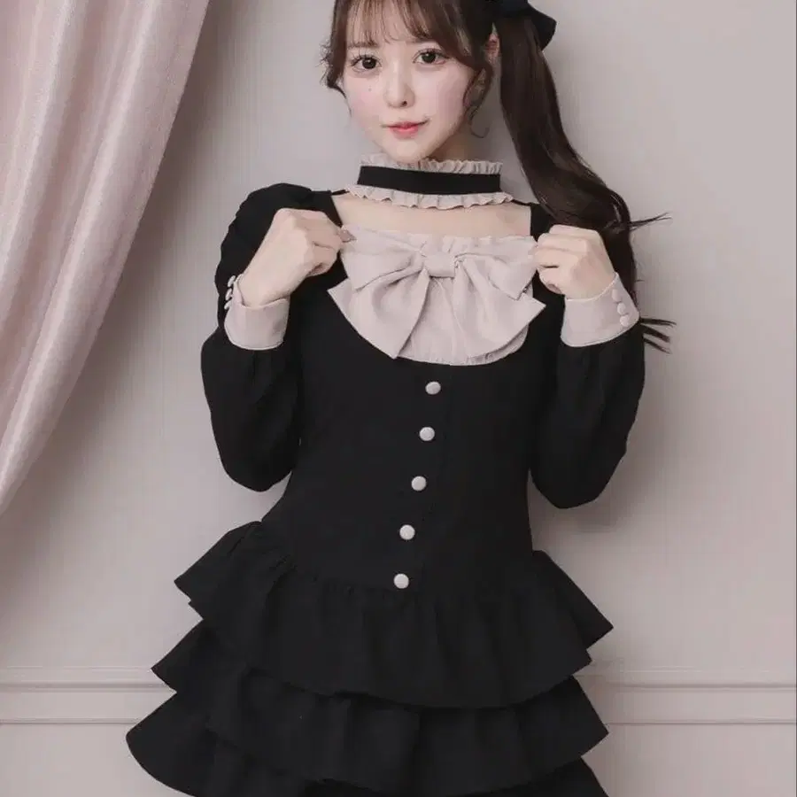 pium 프론트 리본 초커 티어드 미니 원피스 블랙 핑크