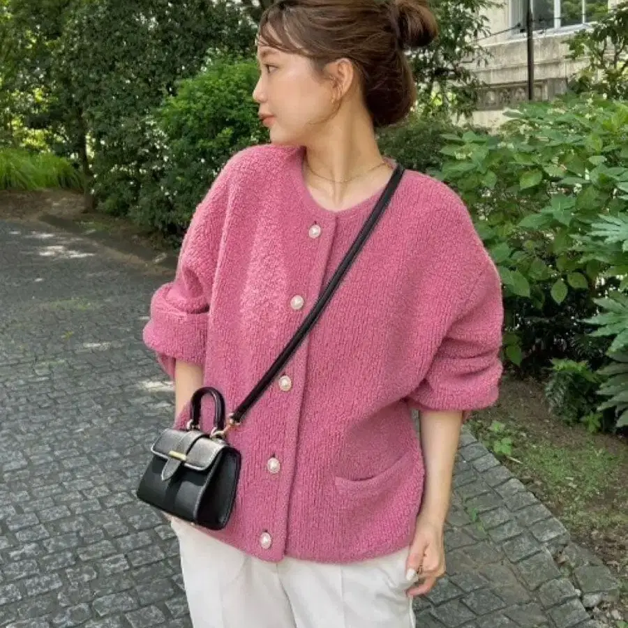 미라 오웬 파일 편직 숏 기장 금장 버튼 니트 자켓 핑크