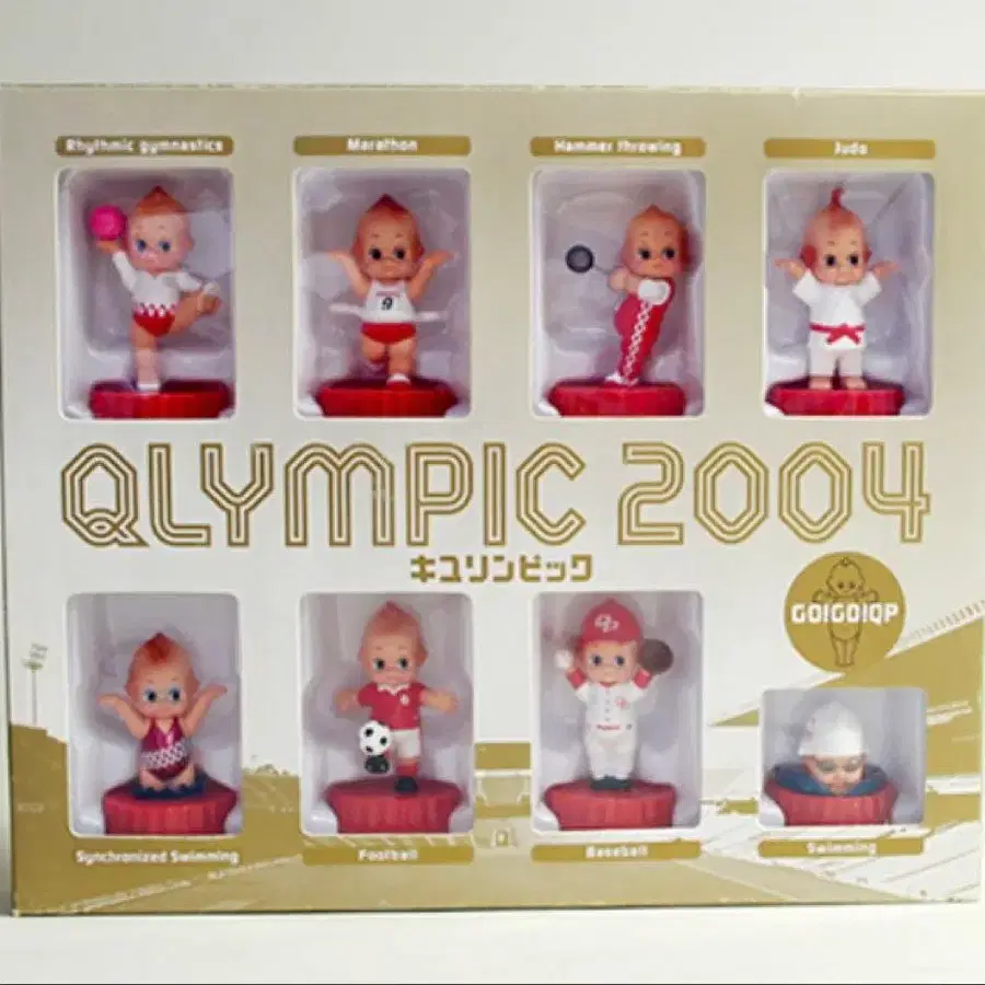 2004년 올림픽을 모티브로 만들어진 큐피의 캡 컬렉션입니다. 그중 마라톤, 유도 등 총 8개 종목을 큐피 인형이 연기하고 있습니다. [스마일 Q짱]이나 [야와라카짱] 등 각 큐피에는 경기에 얽힌 이름이 붙여져 있습니다. 8개 모두 마요네즈 보틀에 설치 가능하며, 즐기는 방법도 다양합니다. 부속품인 외부 박스는 쇼케이스와 같은 디자인이라 보관만 해도 멋진 인테리어가 됩니다. 수량 한정으로 출시된 레어한 일품입니다.