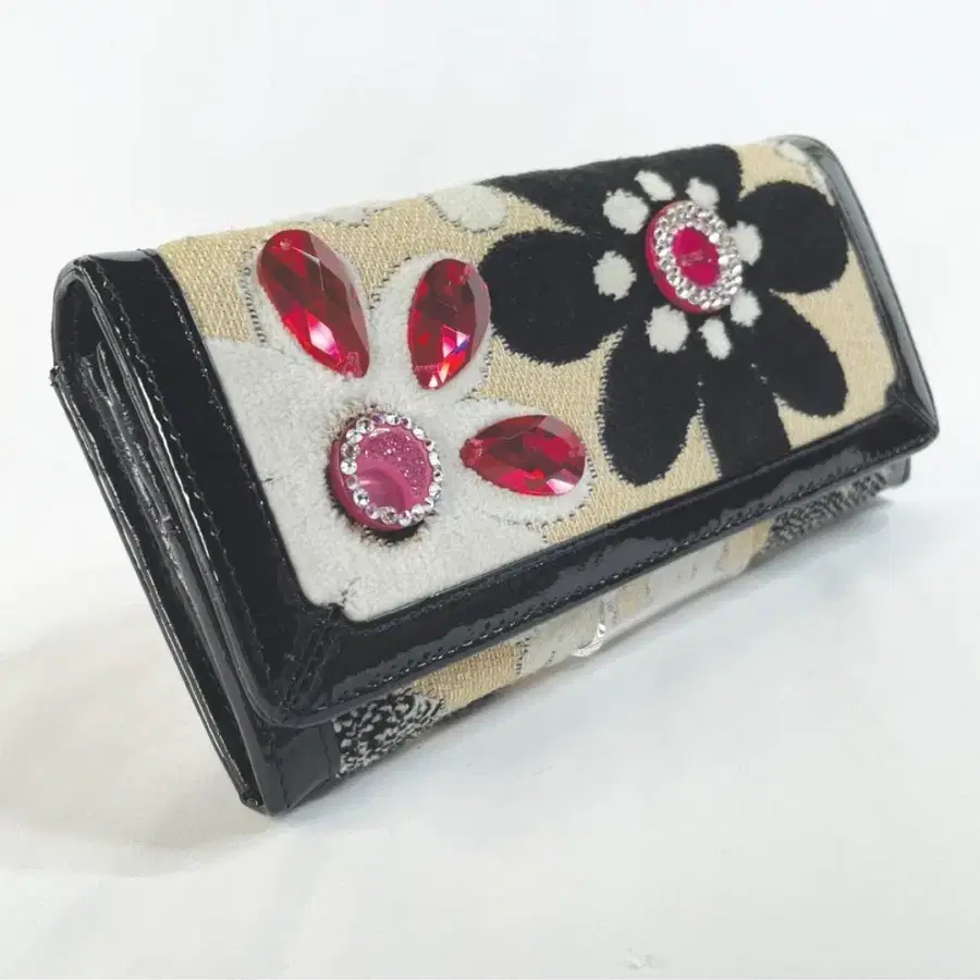 화이트 바탕에 블랙의 빅 사이즈 꽃무늬가 대담하게 장식되어 있으며, 여기에 선명한 핑크색 비쥬가 꽃잎과 중앙에 럭셔리하게 배치되어 있습니다. 비쥬는 빛을 받아 반짝반짝 빛나며, 들고 있는 것만으로도 기분이 좋아지는 화려함을 연출합니다. 테두리에는 광택감 있는 블랙 소재가 사용되어 전체적인 인상을 잡아주면서 고급스러움도 더했습니다.