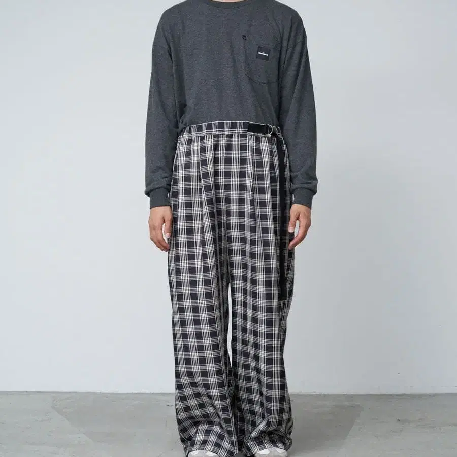 그레이 체크 무늬 사이드 벨트 와이드 슬랙스