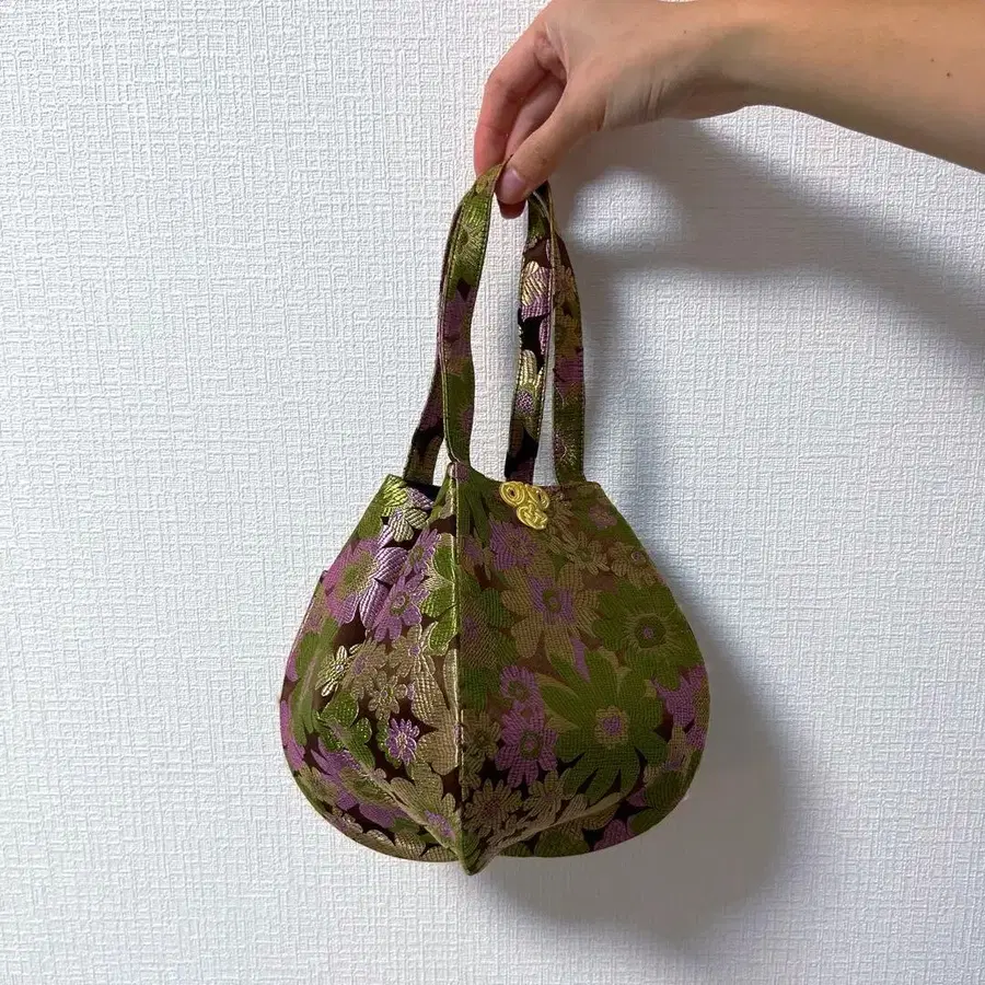 [접이식] 실크 자수 꽃무늬 핸드백 그린과 보라색