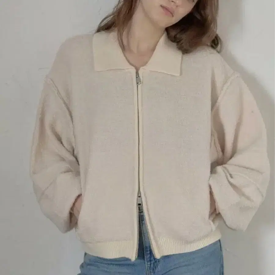 봉쥬르 사간 부클레 카라 부착 니트 블루종 아이보리