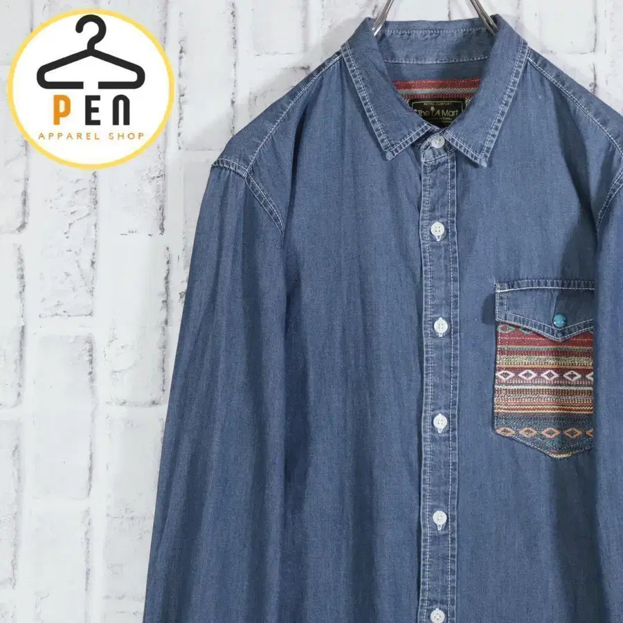 [멕시코풍] 데님 셔츠 자수 포켓 레트로 버튼 비쥬 M