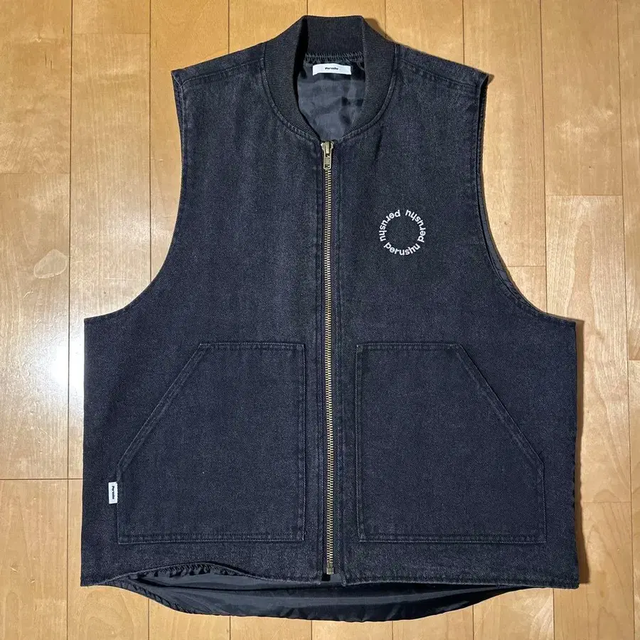 Perushu 블랙 데님 베스트 집업 로고 자수 M
