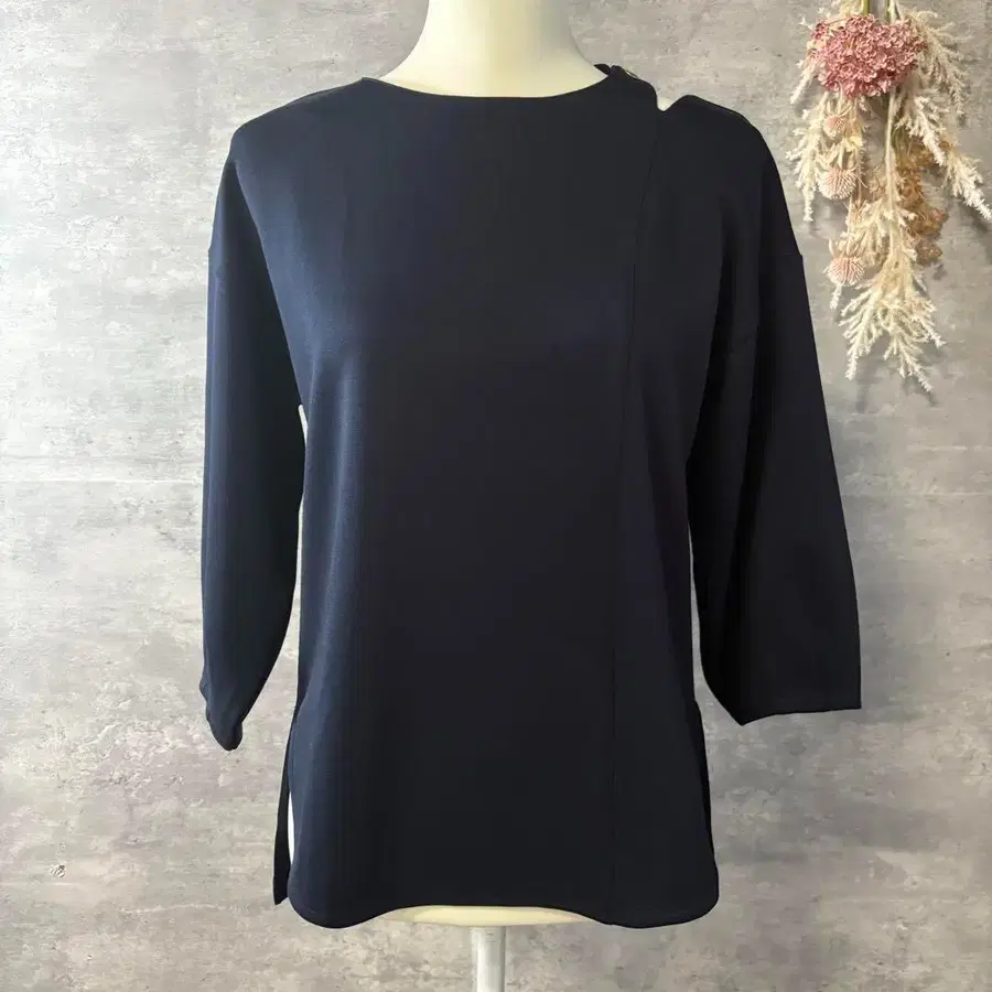 왼쪽 어깨에 슬릿을 넣은 7부 소매 풀오버 티셔츠입니다.