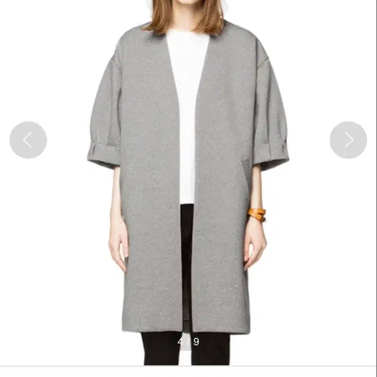 턱을 잡은 하프 슬리브가 인상적인 경량 아우터. 턱 디자인이 구조적인 실루엣으로 완성되어 모던함을 연출합니다. 코튼 폴리에스테르 소재의 던볼 니트를 사용했기 때문에 가볍고 착용하기 쉬우며 탄력이 있어 실루엣을 깨끗하게 유지합니다. 노카라 디자인이라 얼굴 주변은 깔끔하고 이너와도 잘 어울리며, 고급스럽고 여성스러운 인상입니다. 가디건처럼 가볍게 걸칠 수 있어 시즌 중에 대활약하는 아우터입니다. 평소 착용부터 포멀한 자리까지 폭넓게 착용하실 수 있습니다.