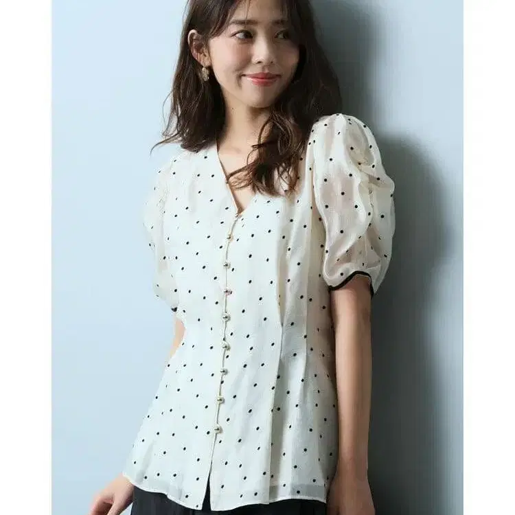 자잘하게 잡힌 비침이 있는 개더 슬리브가 사랑스러움을 연출하는 블라우스입니다.