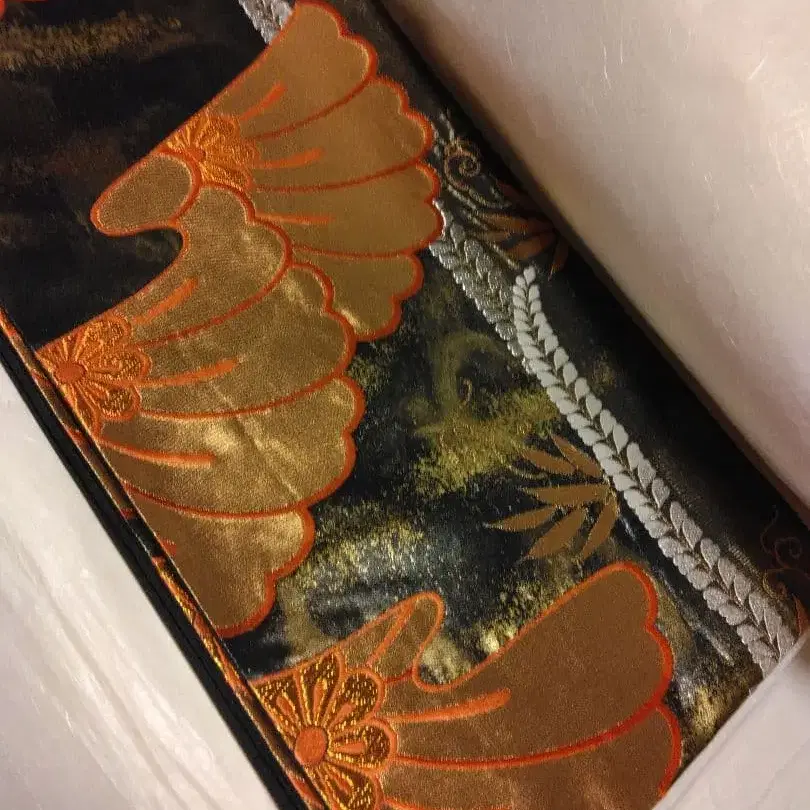 후쿠로 오비 블랙 골드 오렌지 꽃 무늬